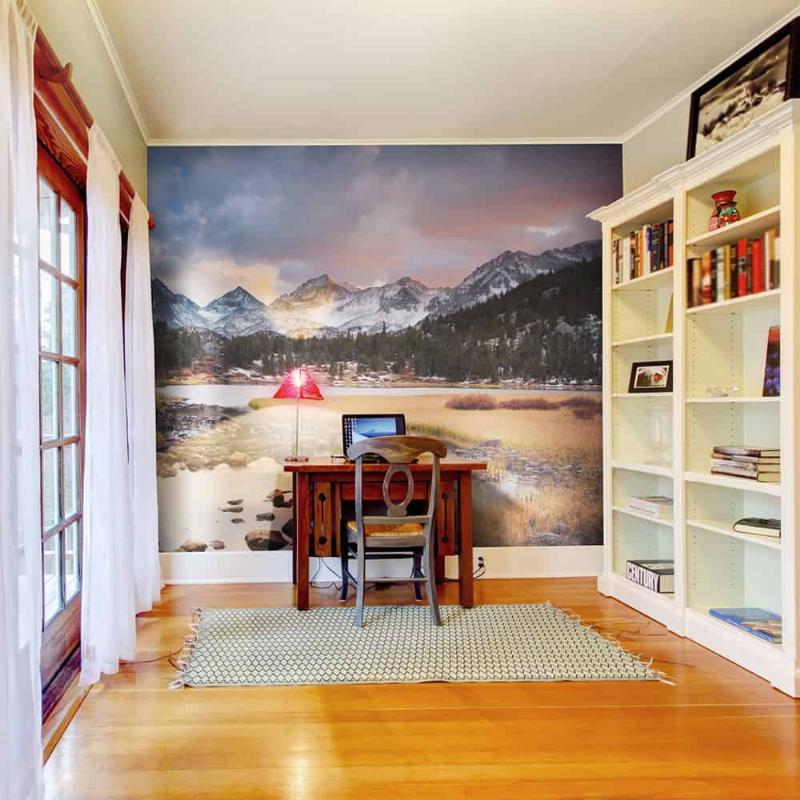 Vores fototapet er fremstillet af materialer af højeste kvalitet, hvilket sikrer, at du får en holdbar og smuk vægdekoration, der holder i mange år. Det er ideelt til stuen, soveværelset eller ethvert rum, hvor du ønsker at skabe en beroligende og naturskøn stemning. Forestil dig at træde ind i dit rum og blive mødt af synet af majestætiske bjerge, der strækker sig mod horisonten – en perfekt flugt fra hverdagens travlhed.